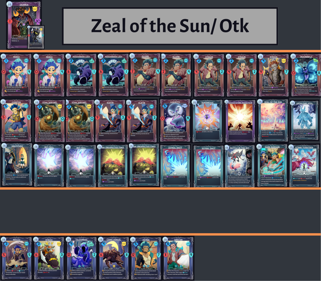 Η τράπουλα περιστρέφεται γύρω από το Zeal of the Sun, μια βασική κάρτα που ενισχύει όλους τους συμμάχους, δίνοντάς τους έξτρα δύναμη και ώθηση για επιθετικό παιχνίδι. Με την υποστήριξη της Meiko και της Stand Together, η τράπουλα αποκτά εκρηκτική επιθετικότητα, επιτρέποντας σε πολλαπλούς χαρακτήρες να πιέσουν ταυτόχρονα. Καθοριστική είναι η χρήση της Gratitude, μιας κάρτας-κλειδί που ανεβάζει το level του παίκτη και ανοίγει τη δυνατότητα για να κατεβάσει περισσότερους χαρακτήρες μέσα σε έναν γύρο, δημιουργώντας ασφυκτική πίεση στον αντίπαλο.