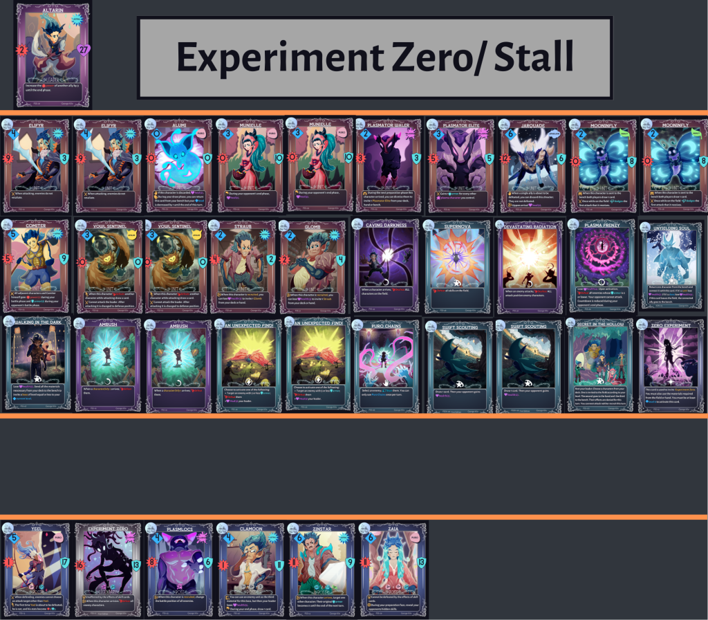 Η τράπουλα του Experiment Zero έχει ως κύριο στόχο να επιβραδύνει το παιχνίδι του αντιπάλου, κρατώντας τον σε απόσταση μέχρι να εμφανιστεί το πανίσχυρο Zero. Εξοπλισμένη με πληθώρα αμυντικών καρτών, η τράπουλα προστατεύει τον παίκτη από πρώιμες επιθέσεις, απορροφώντας πίεση και κερδίζοντας χρόνο. Παράλληλα, κάρτες όπως το Swift Scouting και το Mooninfly επιταχύνουν το card draw, επιτρέποντάς σου να φτάσεις στο Zero πιο γρήγορα. Είναι μια τράπουλα στρατηγικής αναμονής και ελέγχου, όπου κάθε γύρος μετράει μέχρι να απελευθερωθεί η καταστροφική δύναμη του πειράματος.