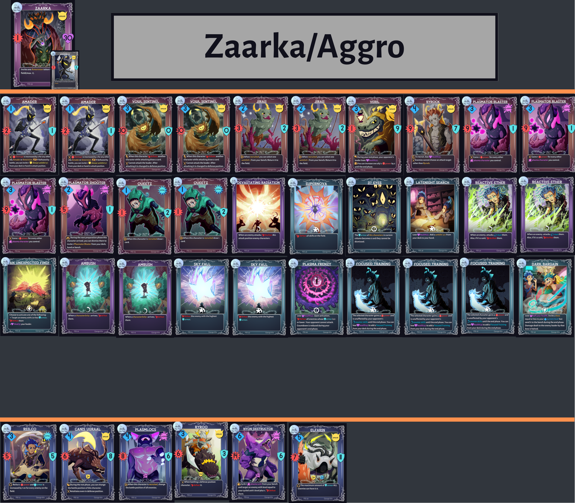 This is an aggressive deck. You want to push and take advantage early as you start losing ground towards the late game. With the small creatures in your card pool, you have a lot of fuel at the start, while those plasma units will keep evolving while thining your deck. With ’37 Eyes’ you can make the best use of your tokens as they will defeat any enemy in this situation. Ryroo is one of your most efficient Bosses and the first to keep in mind. It can be easily recruited with one of your tokens and can easily push through even your opponent’s hardest defenses. Plasma Mass is something to consider if you have the chance to recruit early. It will stall the game a little bit, but it will get you a plus in the long run. Ugraal, Plasmlocs and Elfarin are utility Bosses but it’s always good to rotate around them so that you don’t lose gas. Finally, Nyon Destructor is one of the most efficient Bosses to close the game.